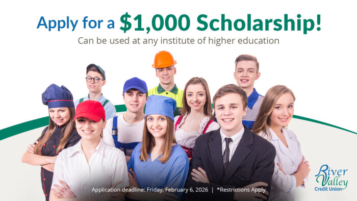 Are you a high school senior getting ready for what’s next—college, trade school, tech program, or another accredited path? As a River Valley Credit Union member, you can apply for a $1,000 scholarship to help you take that next step. Apply with a short essay or a 2-minute video—or submit both to double your chances.